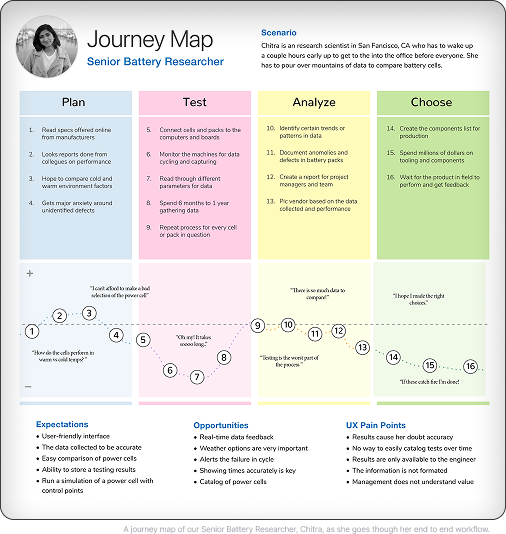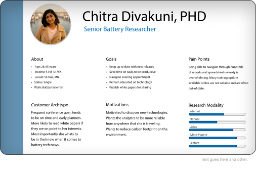 A few personas were created around target consumers to model our user stories into any challenges unique to researching battery cells.