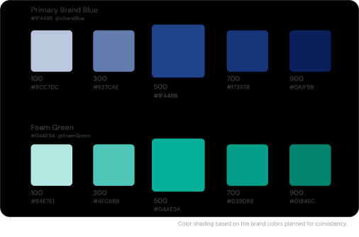 Brand colors depend on a product, service, or company. They can be used as interactive colors, especially when it is necessary to comply with accessibility regulations. All colors are also defined as design tokens — named elements or discrete entities that store specific variables (visual design attributes):