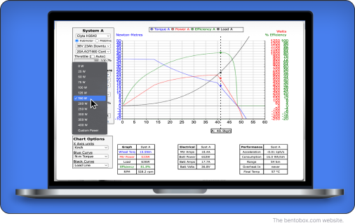 Using the Grin Tech online eBike simulator from the drop-down menu one of our modeled hub motors, the battery pack, wheel size, and motor controller current limit. Then hit “Simulate” and select your bicycle model and weight. The application will then display graphs versus your speed.